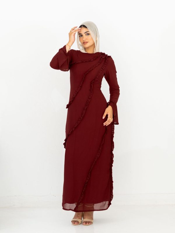Stand out with the Queen Rania dress, made from soft chiffon. This chic and unique design features playful ruffles that give a beautiful shape. Named after Queen Rania, known for her elegance and modern style, this dress makes you feel confident, stylish, and beautifully different.
